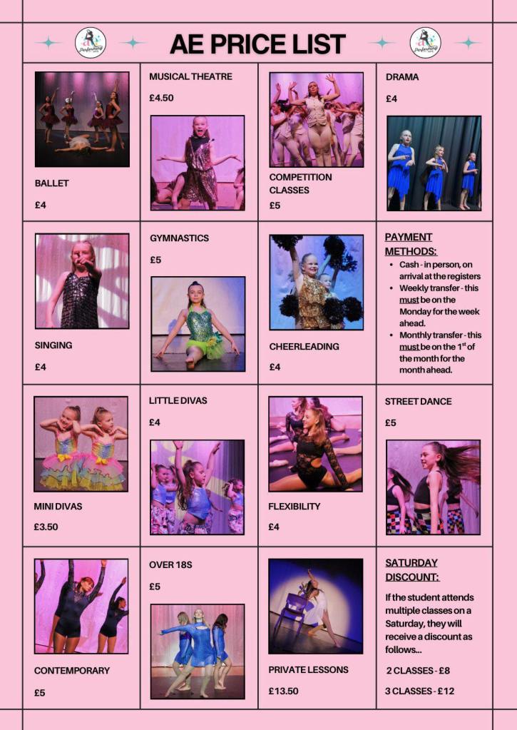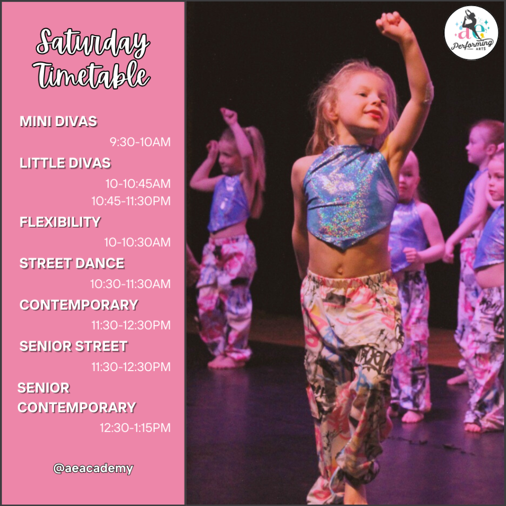 Saturday mornings at AE are full of energy, music and smiles, with a wide range of styles on offer for all ages and levels. From our youngest Mini Divas all the way through to our senior dancers, everyone chooses to kick off their weekend dancing with friends in a fun and supportive atmosphere. The academy is always buzzing with excitement, laughter and passion It’s clear that Saturday mornings are a favourite – everyone truly has the absolute best time.